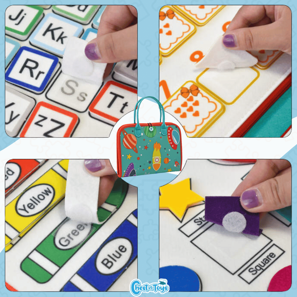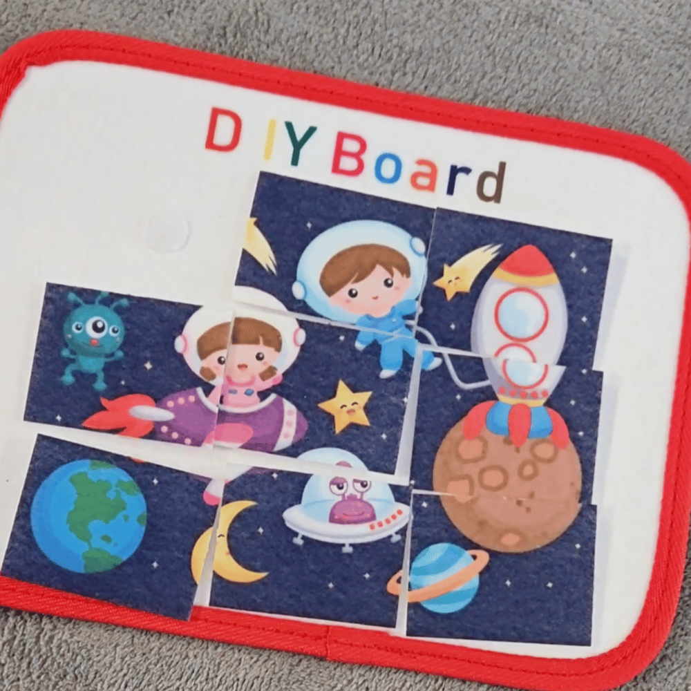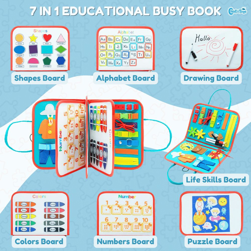 This Busy Board Includes seven different pages such as Life Skills Activities, Colors Board, Numbers Board, Alphabet Board, Shapes Board, Wipeable Draw Board and Space Puzzle Board.